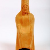 The excavation of the sanctuary brought to light a large number of clay figurines mostly female. The earlier of these are handmade and date to the late 7th-6th cent. B.C., while in the 6th and 5th centuries the type of kore bearing a polos and holding a bird in front of the chest with one hand and fruit or wreath with the other is dominant. The same figure is also shown seated, usually holding a bird on the chest.