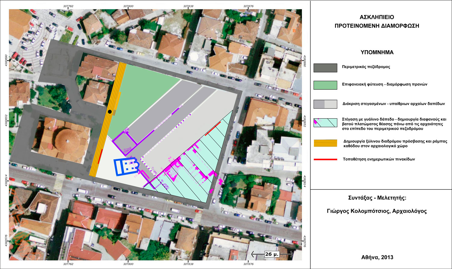 Since no initiative has been taken so far by the Archaeological Ephorate for the conducting of a study for the enhancement of the site in question and because the current economic climate does not allow this study to be taken up by a specializing office, it is proposed to look into the possibility of it being carried out by a team of specialist employees from both the Ephorate and the technical services of the Trikke Municipality. Then after it has been properly approved it can be implemented through the next EU funding programme (NSRF) or by a contract with the Region of Thessaly which will undertake its funding by its own means. It should be noted that according to preliminary figures released for the upcoming NSRF, part of the funding is intended to realize “urban upgrading”. I believe that the proposed works for the improvement of the region of ancient Trikke are in the spirit of the programme in question.