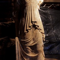 Traces of red pigment are preserved on the pedestal of the Eastern Caryatid. Also, after removing the debris from the area around the two statues, archaeologists found sections of the Caryatids’ arms.