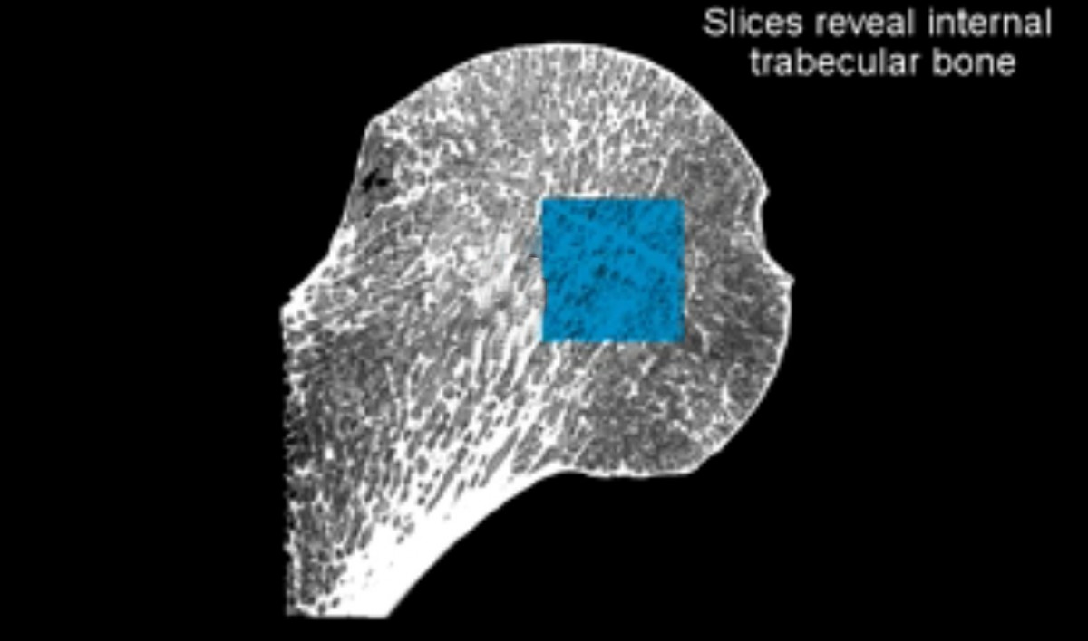 The researchers x-rayed samples of human femur bones from the archaeological record, along with femora from other primate species, focusing on the inside of the femoral head: the ball at the top of the femur which fits into the pelvis to form the hip joint, one of the most load-bearing bone connections in the body.