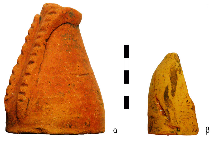The example of two microscopic male figurines, belonging to a common multi-figure model, gives us a characteristic picture of “miniature narrative” in the anthropomorphic pottery of Vrysinas (fig. 3). The fabric, the morphological elements such as the applied codpiece, and the distinctive gesture with the left hand touching the right side of the neck while the other is folded towards the chest, the pointed oval head, and the proportions and outlines of the body, are all identical. Moreover, the separate impressions on their short lower limbs and the relative curve on the back of the legs permit us to hypothesise that they were attached to a vertical element of the “scenery”, i.e. the base, of the multi-figure model on which they were set. On the basis of other corresponding examples, the figures were presumably arranged in a circle.