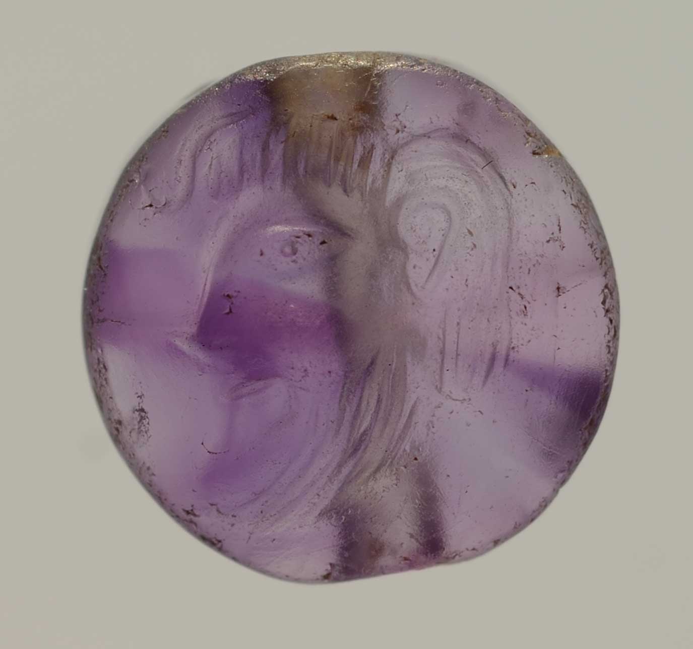 On this minuscule amethyst disc-shaped seal (measuring 9mm in diameter), a gifted and experienced Minoan craftsman has depicted a lively, exquisitely detailed and unprecedentedly artistic representation of a male head in profile. The man has a beard, fluffy hair with a characteristic lock over the forehead and his mouth is open. A transparent hole permitted the object’s use as a neck or arm pendant.