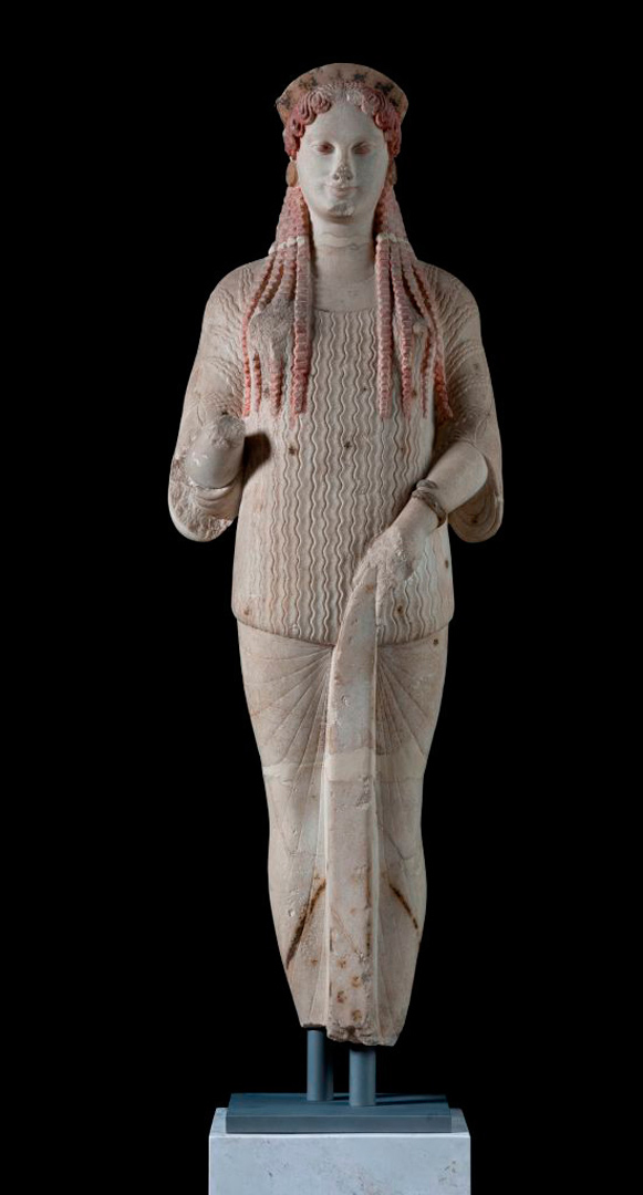 The earliest known statues of korai date from the 7th century BC, but archaic sculpture reached its true peak in Athens from the late 6th to early 5th century BC. The statues of korai found on the Acropolis had a votive function, being dedicated to the Temple of Athena and erected as a gift to the goddess: today they are known as “the daughters of the Acropolis”. In total around 200 sculptures depicting maidens in the bloom of youth have been found on the Acropolis. The korai differ in size, facial features and details of hairstyle and clothing, but all the sculptures belong to a single type of statuary, with the figure presented in a strongly frontal manner. The pose and composition of the statues continued the Ancient Egyptian tradition, which was, however, completely rethought by the Greek sculptors of the Archaic period, who breathed life into the static forms of eastern sculpture.