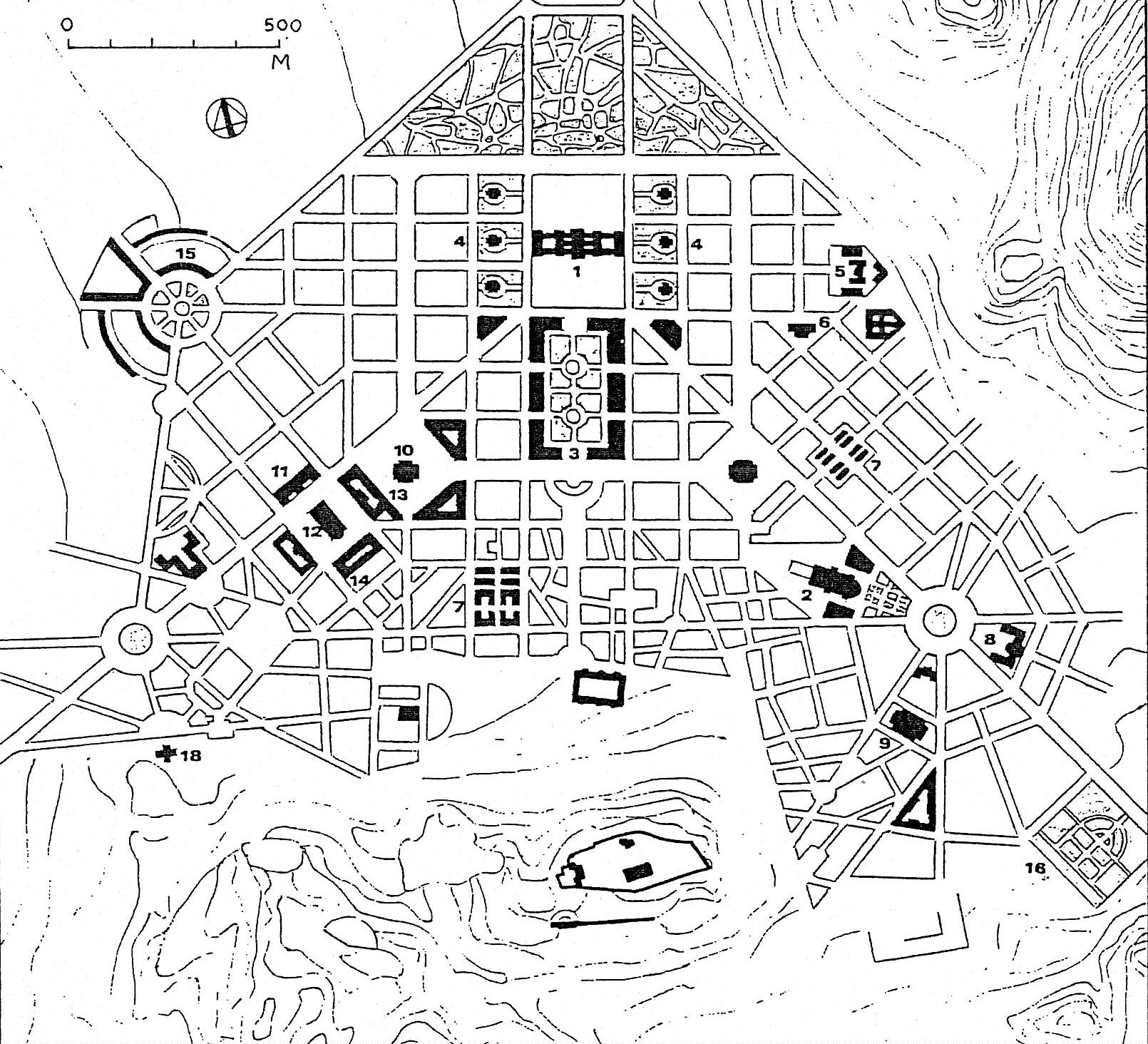 Fig. 3: 1. Palace 2. Cathedral 3. Central Marketplace 4. Academy 5. Library 6. University 7. Exhibition Hall 8. Ministries 9. Senate 10. Parliament 11. Barracks 12. Church 13. Post Office 14. Prison and Police 15. Theatre 16. Markets 17. Diocese 18. Schools.