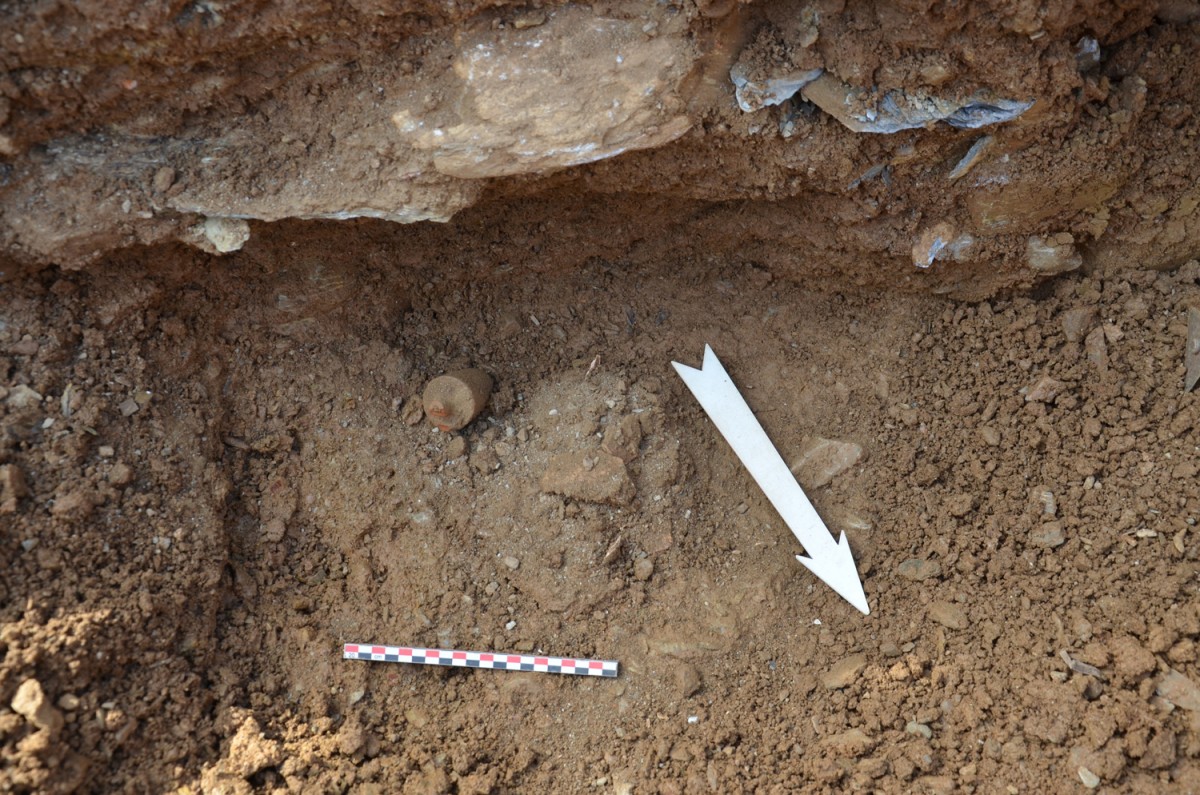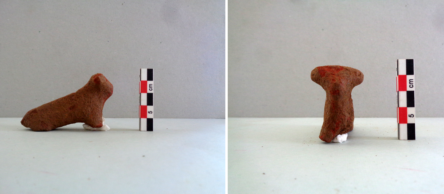 In the northeastern corner of the trench, but on a higher level, an intact unpainted clay figurine of a bovine and an elongated bone were found in an accumulation of plate-shaped stones.
