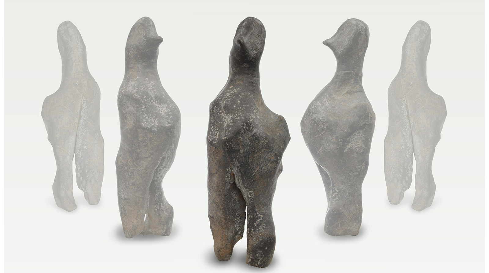 Stone figurines, as a rule, are scarce, usually of small size and made of soft rocks. Furthermore, only a small percentage (5%) of Neolithic figurines falls into the category of largesized ones, namely over 35 cm in height. The bird-like figurine has a markedly rounded belly, while its back is flat. The legs, rendered as cylinders, are abruptly cut off, hampering the figure to stand stable. The dark grey surface is the end result of polishing, as indicated by the unworked facets of the pubic area, which display the original lighter colour of the stone.