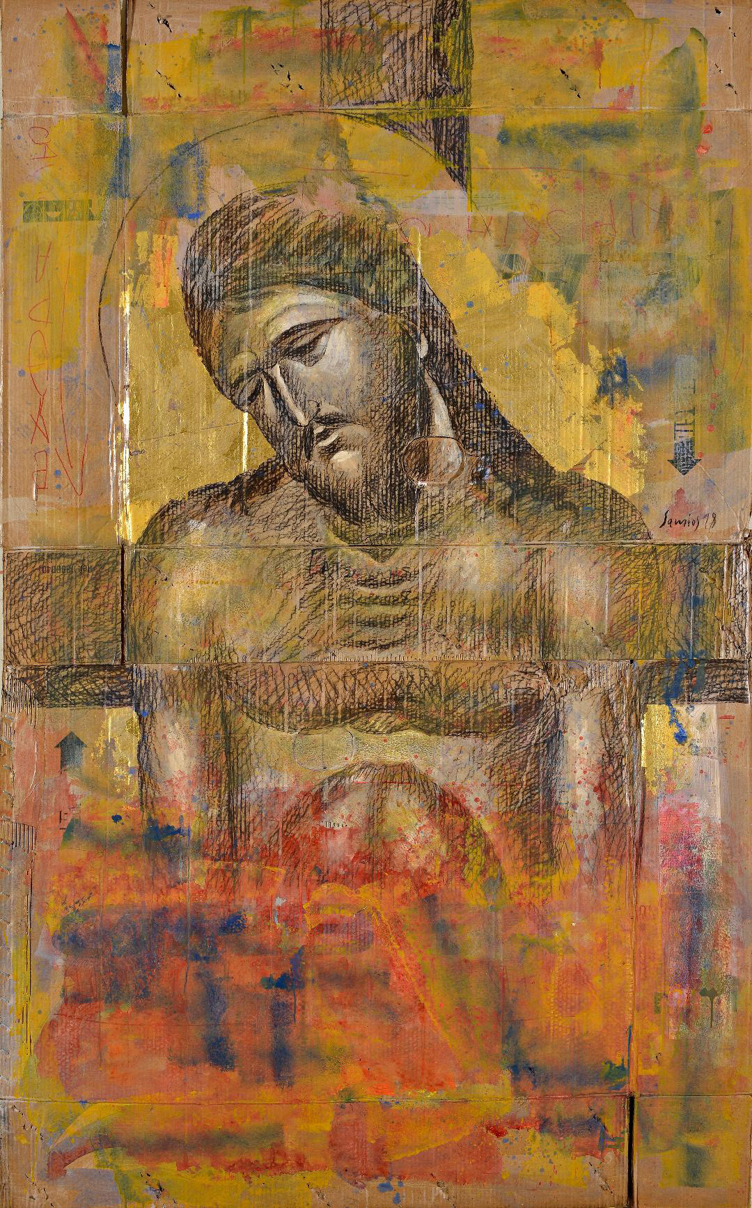The exhibition begins with the culture of Byzantium. On the ground floor of the two storey Villa Ilissia, visitors encounter works depicting Jesus Christ painted in one piece on opened cardboard boxes, reminding one of his “sacrifice″ and the time of year we are currently going through, up to Easter. “Here is Byzantium. Jesus Christ, Christ’s Humiliation, The Descent from the Cross , The Lamentation on the Tomb and a Saint George for our protection. I did not choose the big events of Christ’s life but scenes after his death and before his Resurrection, when he was still human. I wanted to give greater significance to the sacrifice of a man for the sake of us becoming better. In these works nothing is ‘broken’, just slightly worse for wear because they are on cardboard. The feeling is more that we have also caused trouble to our religion and faith” says the painter to the AMNA about the works on show on the ground floor. Among them are some of his earlier works from the time he taught at the School of Fine Arts and which he believes are suited to the spirit of the Museum.