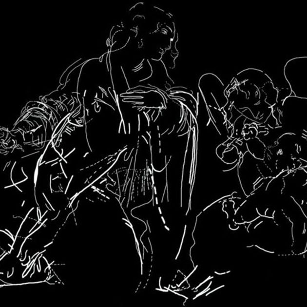 The figures of the painting are depicted in two distinct drawings in different poses. In the first drawing the infant Christ is embraced by an angel more tightly and both are positioned higher up, while the Virgin is depicted looking at them. The second underdrawing is more similar to the final version, but the infant Christ’s head is seen in profile and some parts of the angel’s curly hair have been removed. This second version displays the artist’s characteristic elaborations and adjustments from drawing to painting.