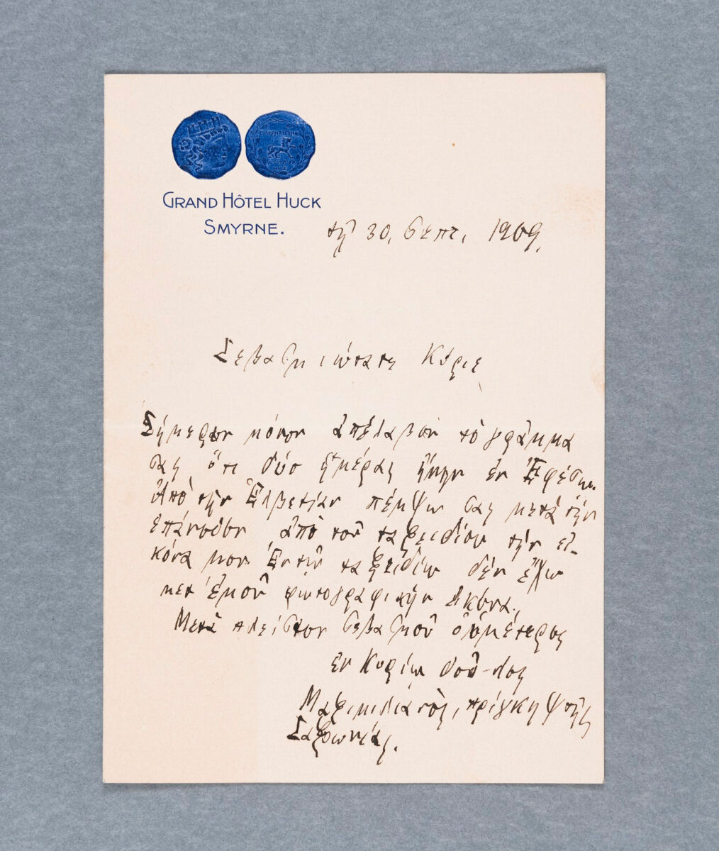 The exhibition uses the archive of the Byzantinist Georgios Lampakis as a vehicle for depicting Smyrna, the capital of Ionia, its society, monuments and people as an exemplar among the rest of Asia Minor cities. At first, the work and personality of Georgios Lampakis are delineated, and the broader historical and socio-political circumstances of his activity are outlined. The next point of interest for visitors is Asia Minor and the way Georgios Lampakis saw the region through his book Οι Επτά Αστέρες της Αποκαλύψεως (The Seven Stars of the Apocalypse). Smyrna, its buildings, society and people are presented through letters, newspapers, photographs and postcards of the early 20th century. The last part of the exhibition deals with Georgios Lampakis’s perception of Asia Minor monuments, ancient and byzantine, as he documents them; the martyrdom site of Saint Polycarp, identified as a place of memory for the city’s Greek community; the significance of Greek inscriptions and, finally, the role which archaeology played in the context of the Great Idea (Megáli Idéa). The Archive of Georgios Sotiriou, kept at the Byzantine and Christian Museum, enabled us to expand the exhibition narrative to the period before the 1922 Catastrophe, as he directed excavations in the region of Smyrna during its occupation by the Greek Army.