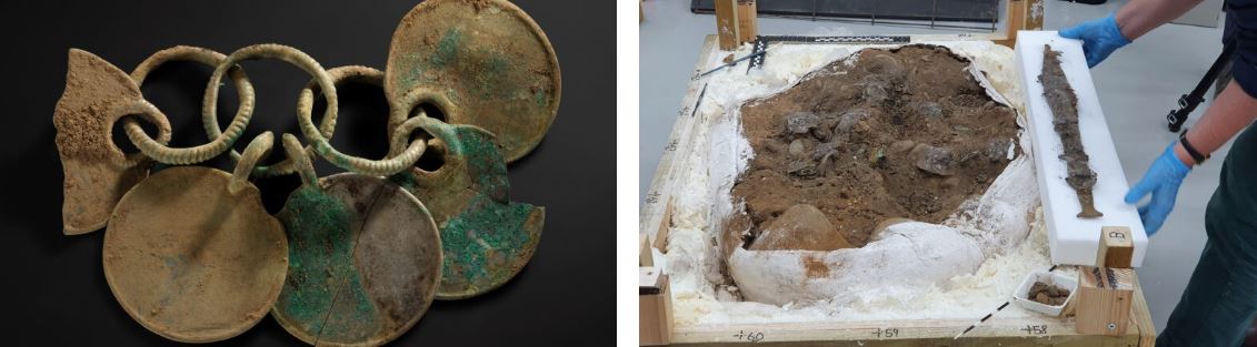 An array of small bronze buttons looped onto cords and the remains of decorate leather and wood straps embedded with minute bronze pins, studs and bosses were also recovered, but the purpose of these remains is yet unknown.