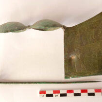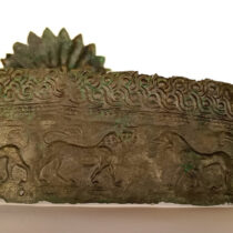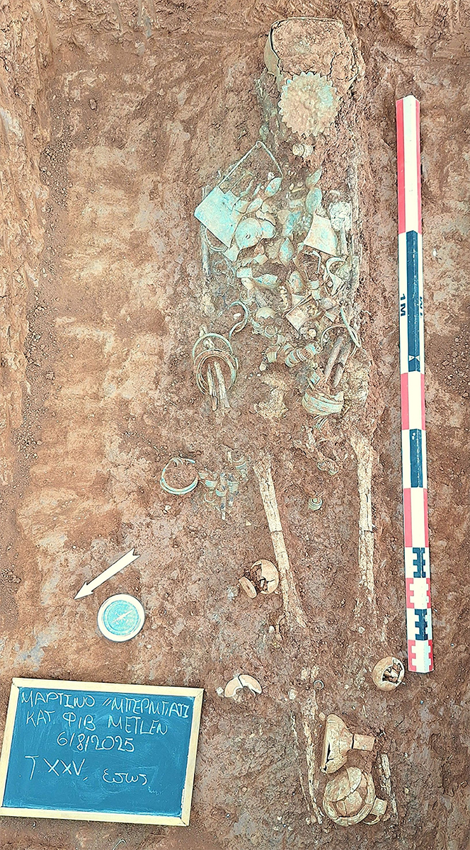Particularly striking is the “Burial of the Lady with the Inverted Diadem”, dated to the second half of the 7th century BC. The burial is part of a cluster of three pit graves. According to preliminary analysis of dental remains, the noblewoman’s burial belongs to an adult woman who was between 20 and 30 years old at the time of her death. An elaborate bronze diadem was found carefully placed on her head. The diadem is band-like and has a large rosette at the center of the forehead shaped like a sun, symbolizing the woman’s high status and authority.