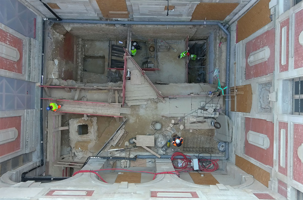 The two courtyards are located at the heart of the Queen’s apartments, in the central southern wing. This wing was built on top of the filled moat of architect Le Vau’s original 1630s hunting lodge, which would later become the first château of Louis XIV. Archaeologists therefore focused on studying the moat-filling levels down to the sandy substrate at a depth of 3.2 meters. Among the remains uncovered were foundations of colonnaded galleries which no longer exist, stone drainage systems, vaulted hydraulic passages, monumental rainwater collectors, and semicircular vaults from the late 17th century. The density of structures in both courts and the clear stratigraphic record will allow a precise reconstruction of the architectural evolution of these spaces.