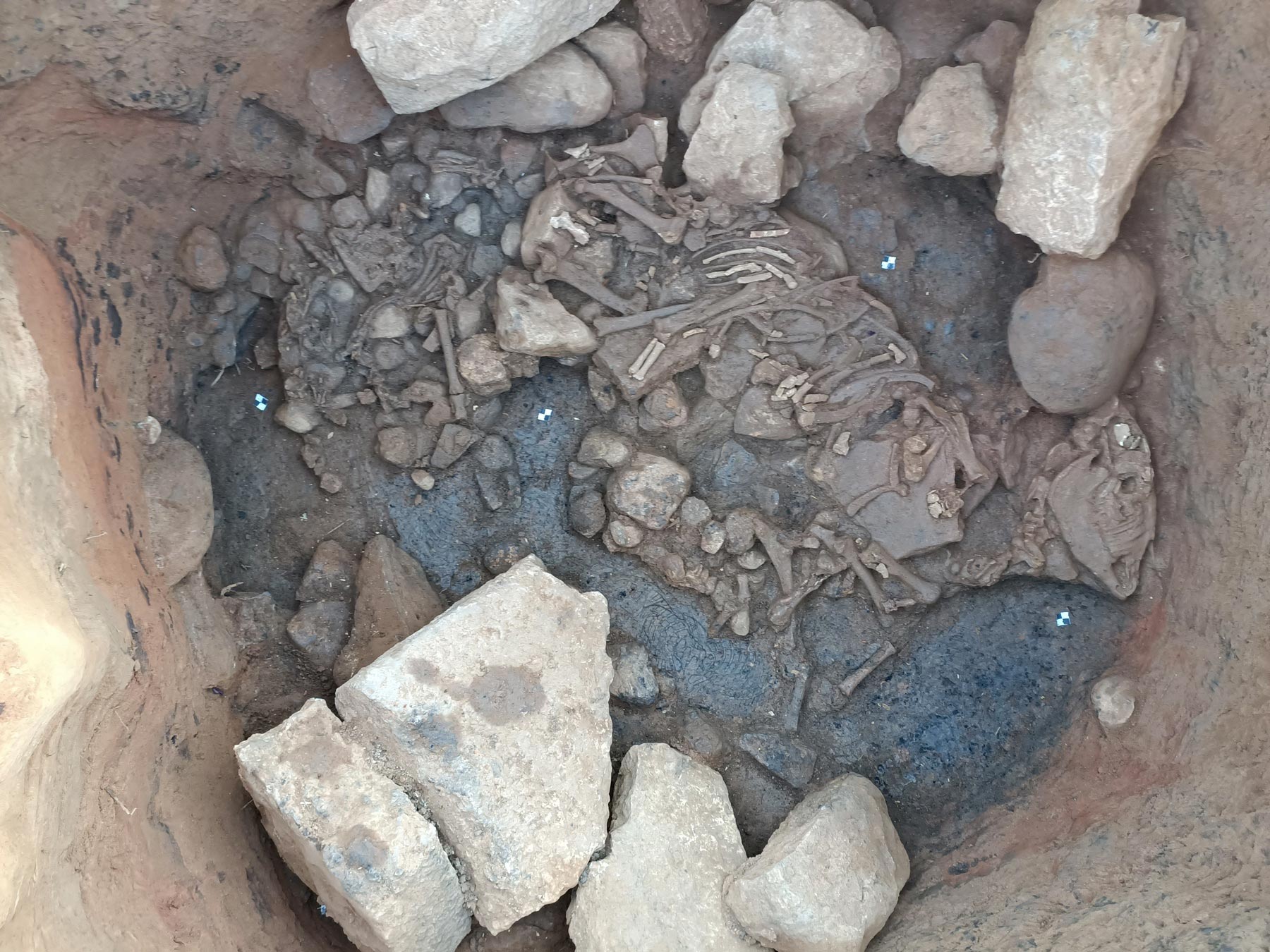 The pithos had been placed in a pit cut into the clayey marl of the southern riverbank. It stands 1.74 meters tall, has horizontal handles at the belly level, and bears the characteristic corded relief decoration around the neck and handles. Its mouth was sealed by a robust semicircular wall made of river cobbles, while two large stones with smaller slabs between them formed a pseudo-door with jambs and a threshold leading into the vessel. Inside, resting on a layer of sand and pebbles, were the bones of two individuals, covered by large stones occupying nearly the entire available space.