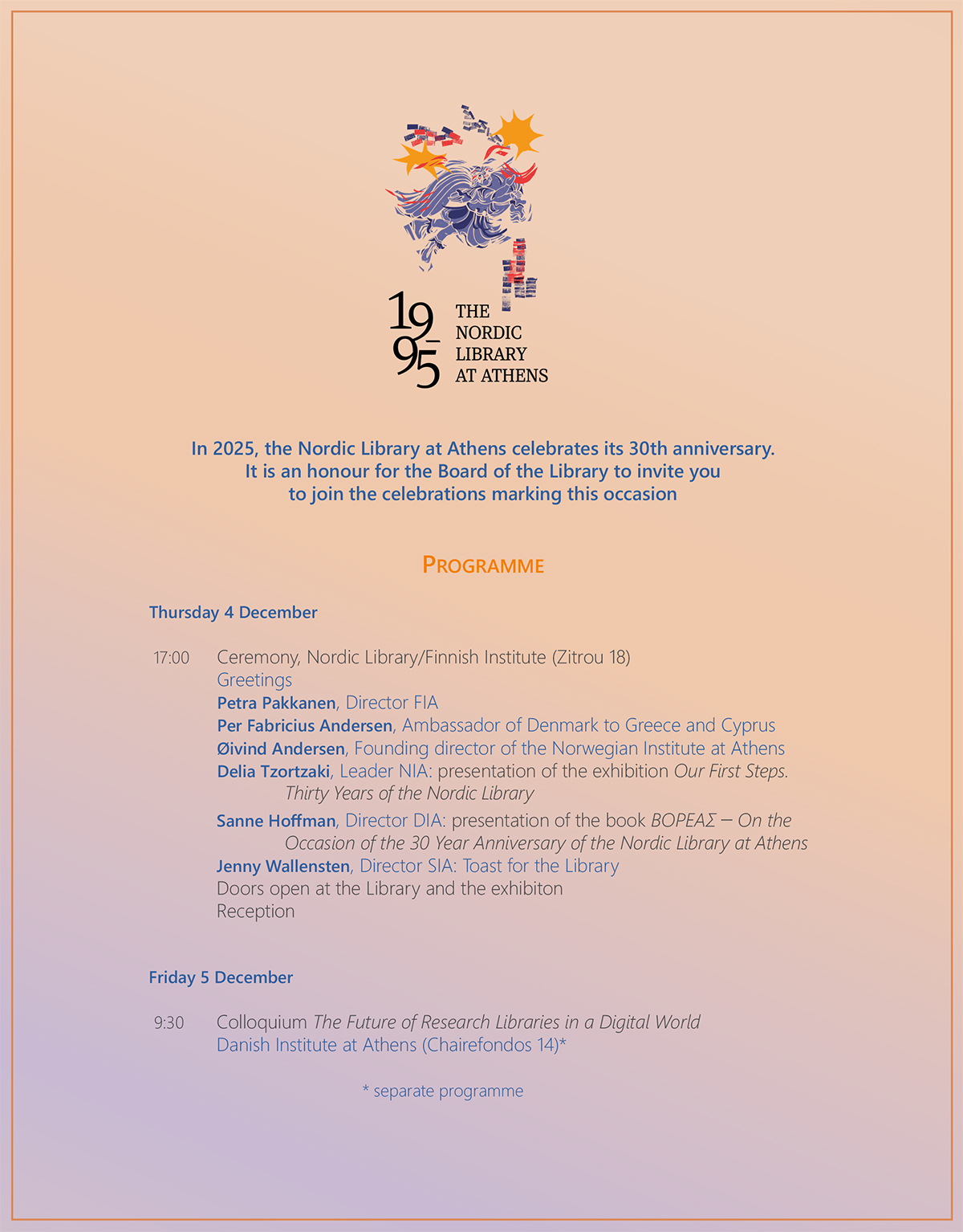 The jubilee celebrations of the Nordic Library at Athens include a ceremony at its premises, followed by an exhibition, on 4 December 2025, and a celebratory colloquium on 5 December 2025, hosted at the Danish Institute at Athens, under the title “The Future of Research Libraries in a Digital World.” All events form part of the jubilee celebrations of the Nordic Library at Athens.