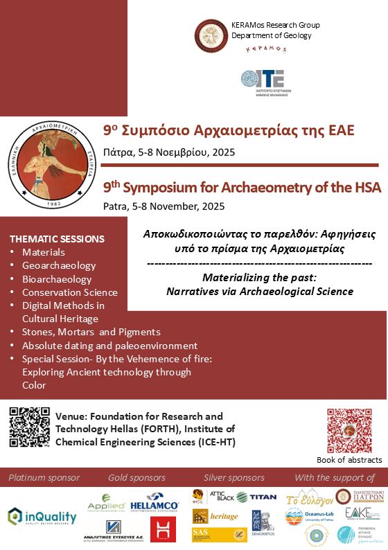 The Hellenic Society for Archaeometry (HSA) is pleased to confirm the organization of the 9th Symposium of Archaeometry, titled “Materializing the Past: Narratives via Archaeological Science”, to be held in Patras from November 5th to 8th, 2025. Organized in collaboration with the Keramos Research Group of the Department of Geology at the University of Patras and the Institute of Chemical Engineering Sciences (FORTH/ICE-HT), the event has already generated considerable interest among both Greek and international scholars.